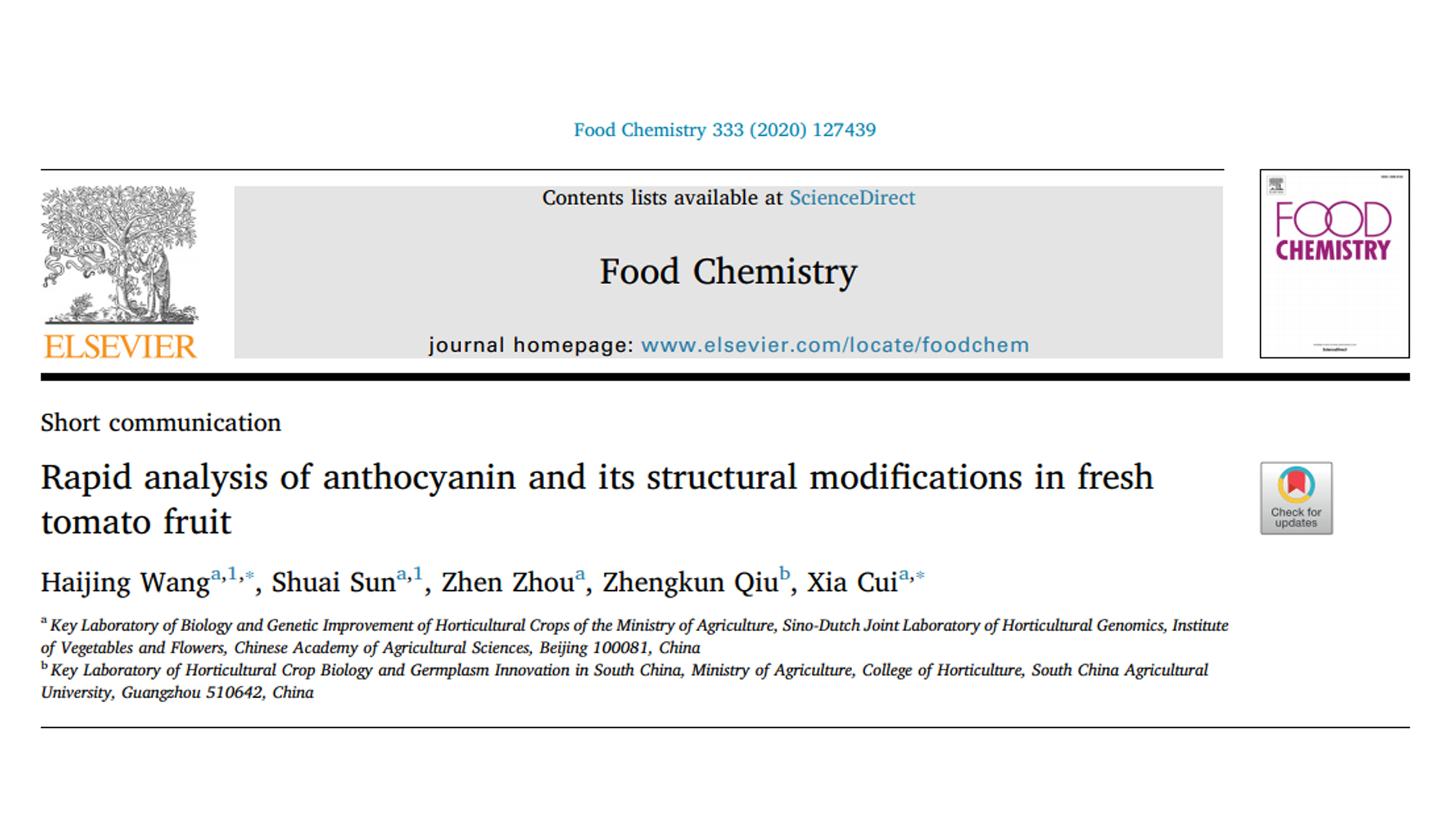 近日,麻豆社 崔霞课题组通过对紫果番茄中花青素的测定,解析了番茄果实中花青素结构及主要修饰类型,并发现了四种新的花青素成分。相关研究内容“Rapid analysis of anthocyanin and its structural...